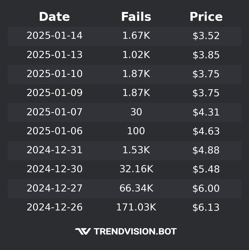 Displays the number of fails to deliver for a stock, along with the price at which the fails occurred.