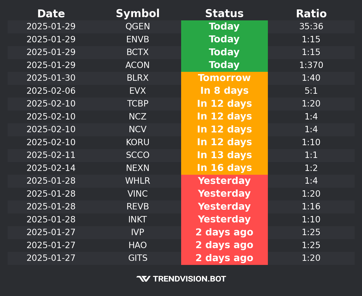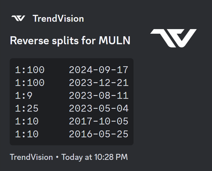 View the latest reverse and forward stock splits. Use '.rsc' for all splits, '.rsc R' for reverse splits, and '.rsc F' for forward splits.