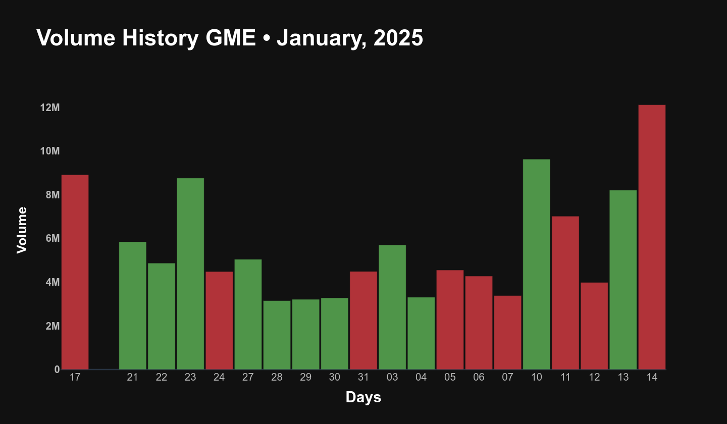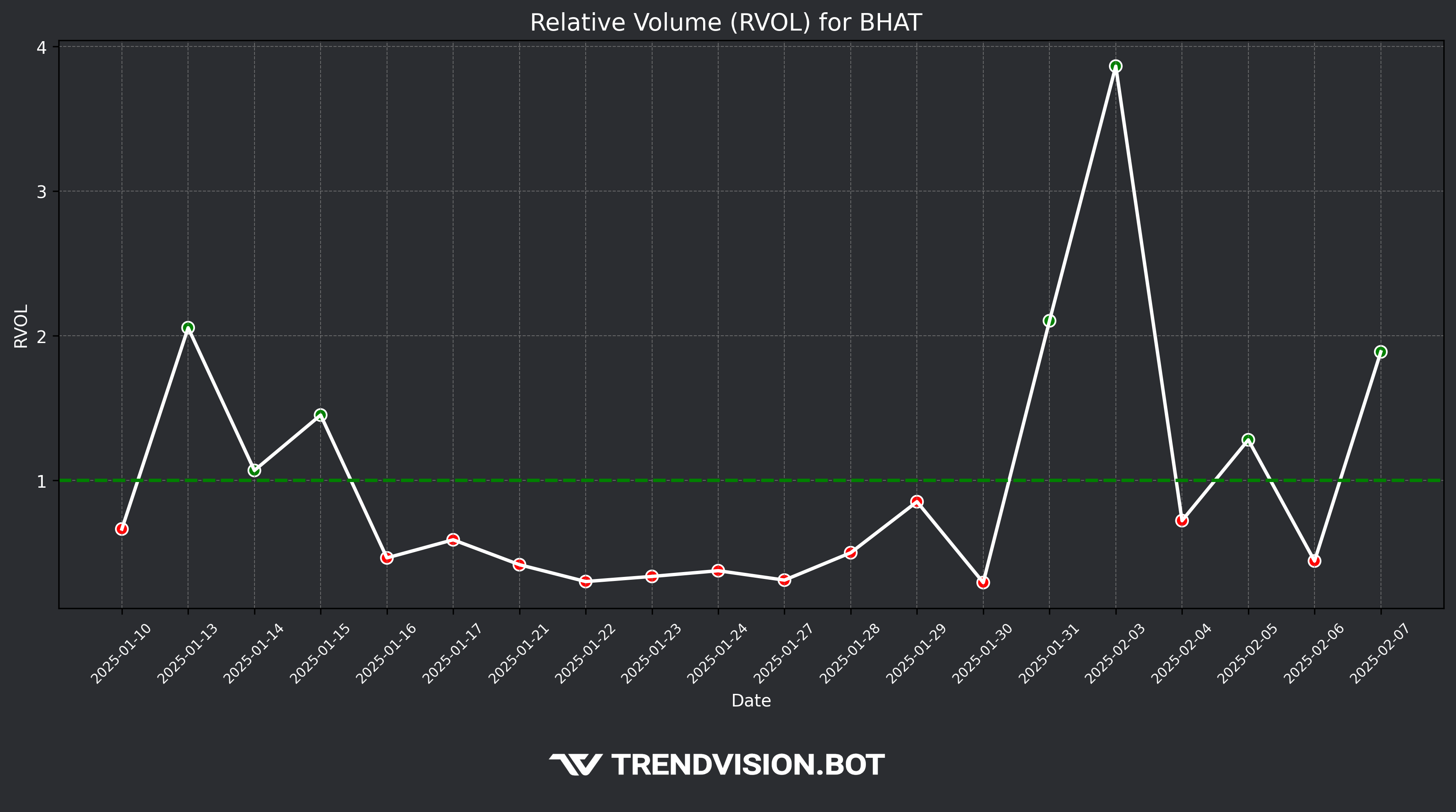 Displays a stock's relative volume over different time periods (1M, 2M, 3M, 6M, 12M) based on historical data.