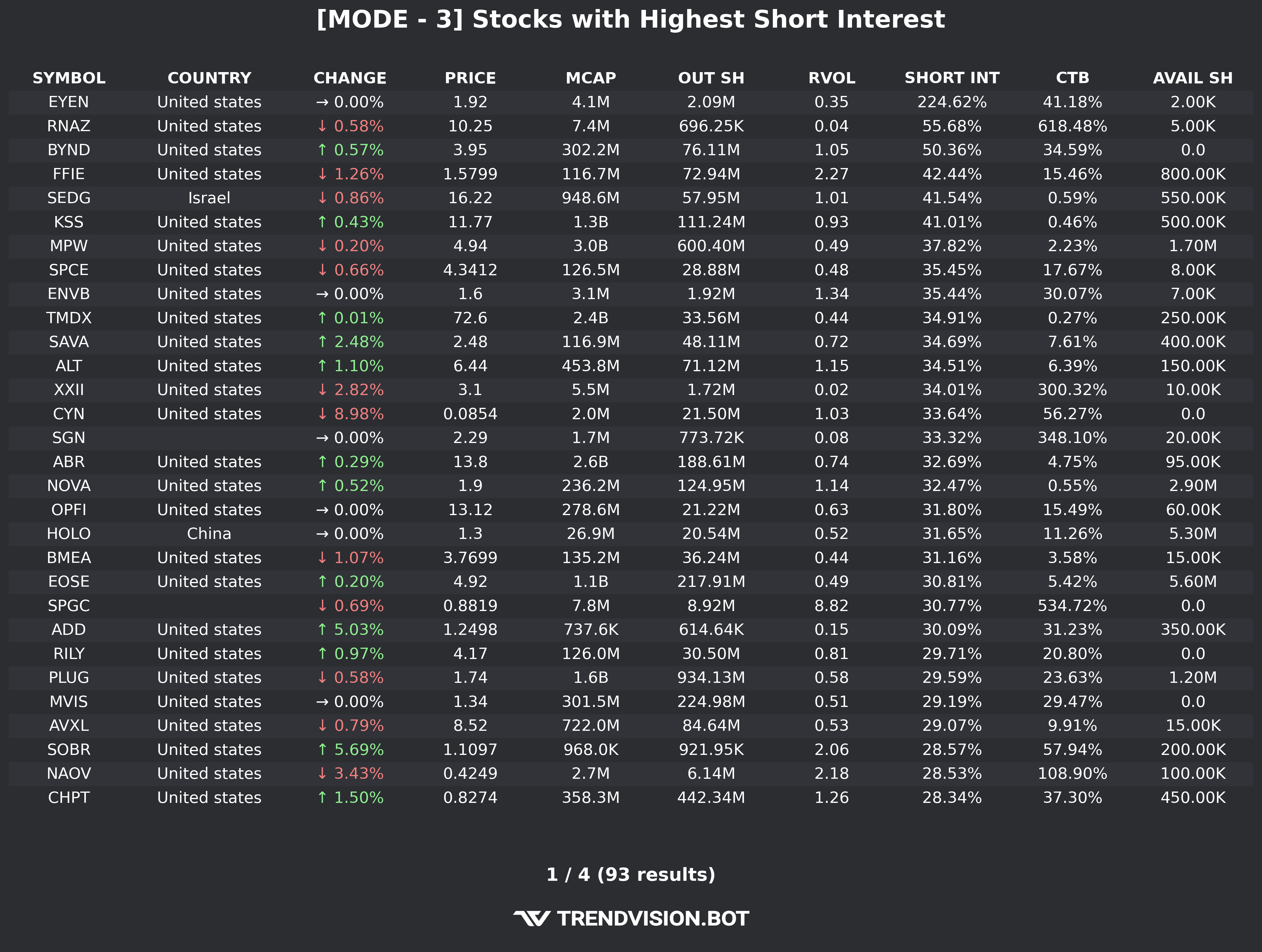 Receive alerts for stocks with zero available shares to borrow, helping you identify short-squeeze opportunities.