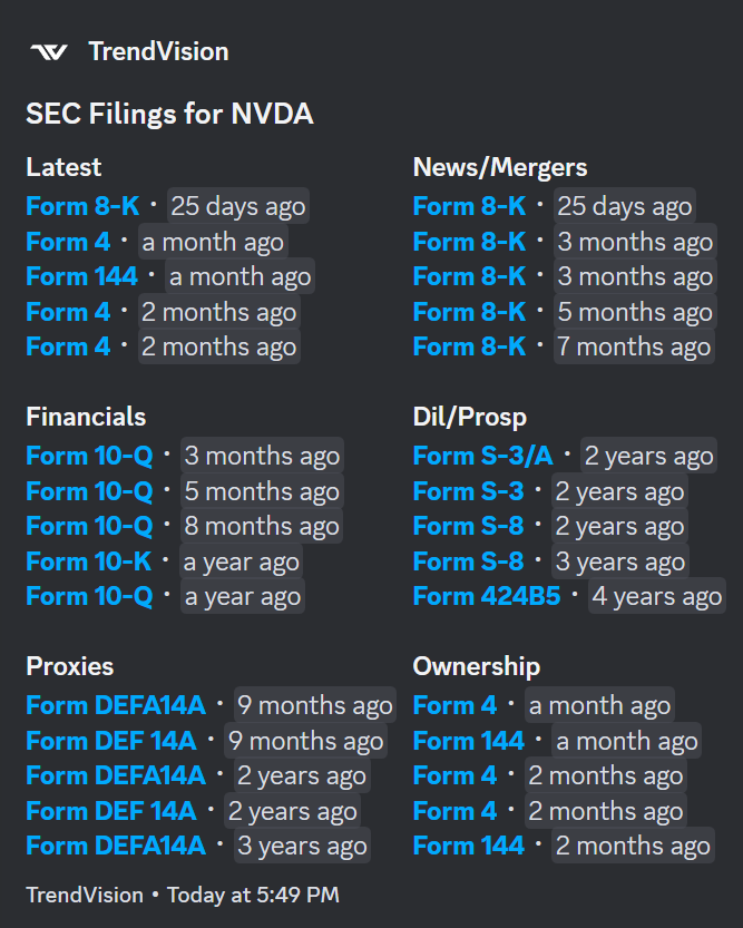Fetches SEC filings for a stock by category. Use '.sec' followed by the stock symbol or specify a form like '.sec nvda 8-K'.