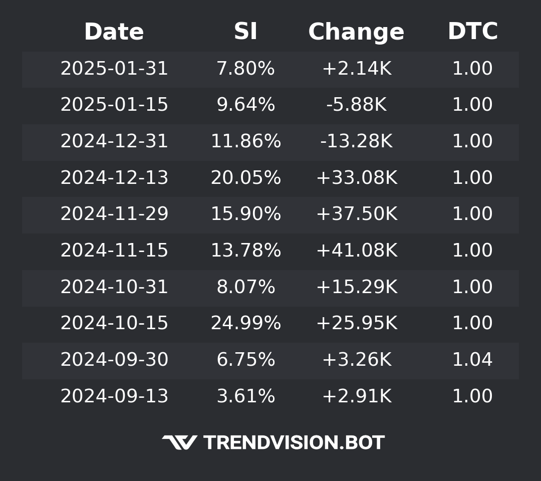 Displays the short interest for a given stock, including the change from the last reported data and the days to cover.