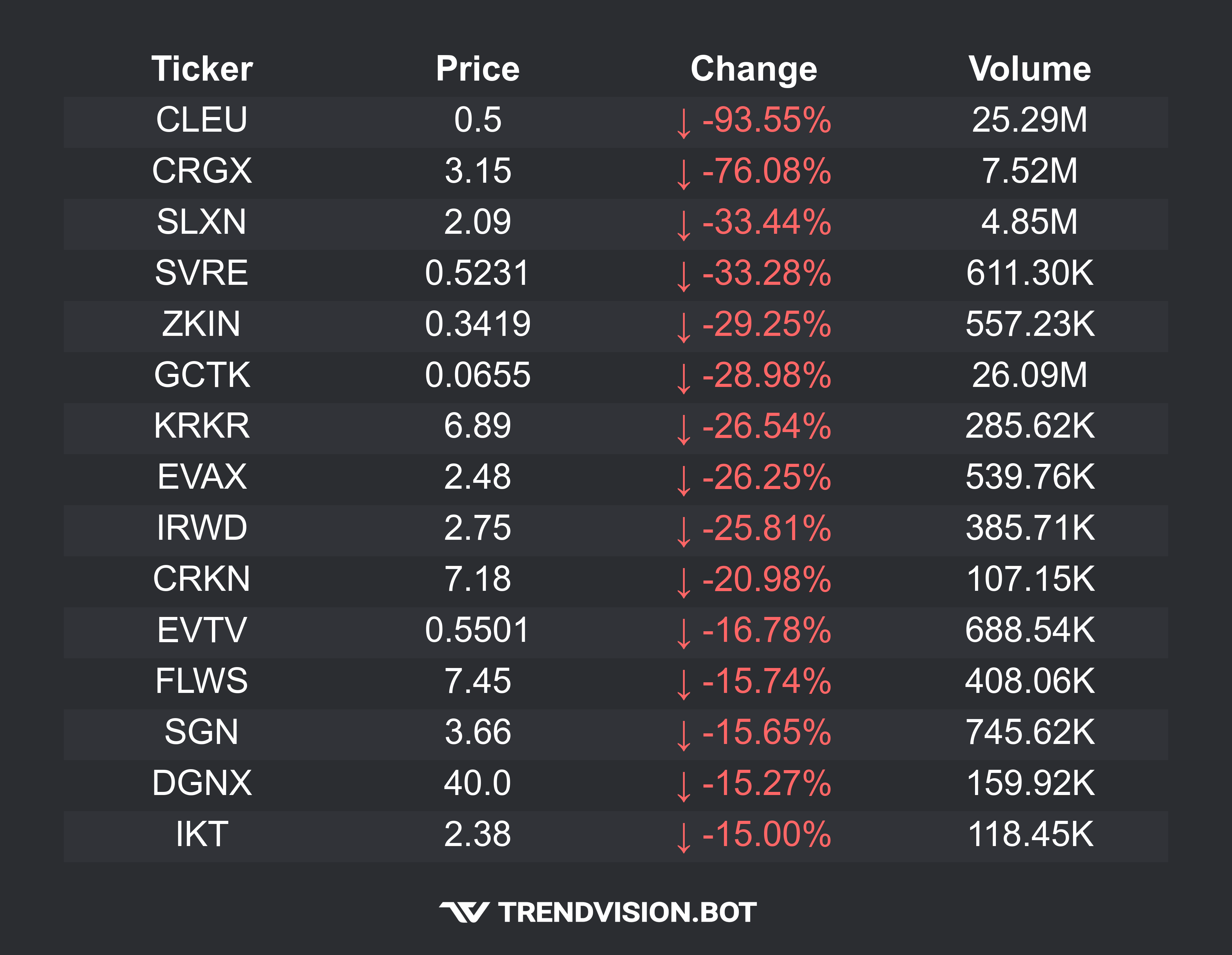 Displays the top losers stocks for current market session (Pre-Market, Regular, After-Hours) or time frame (1D, 5D).