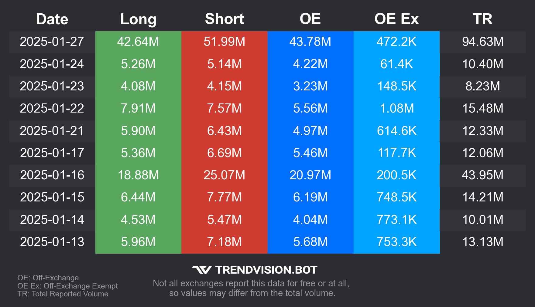 Displays volume report for a specific stock, including short/long trades and off-exchange activity.